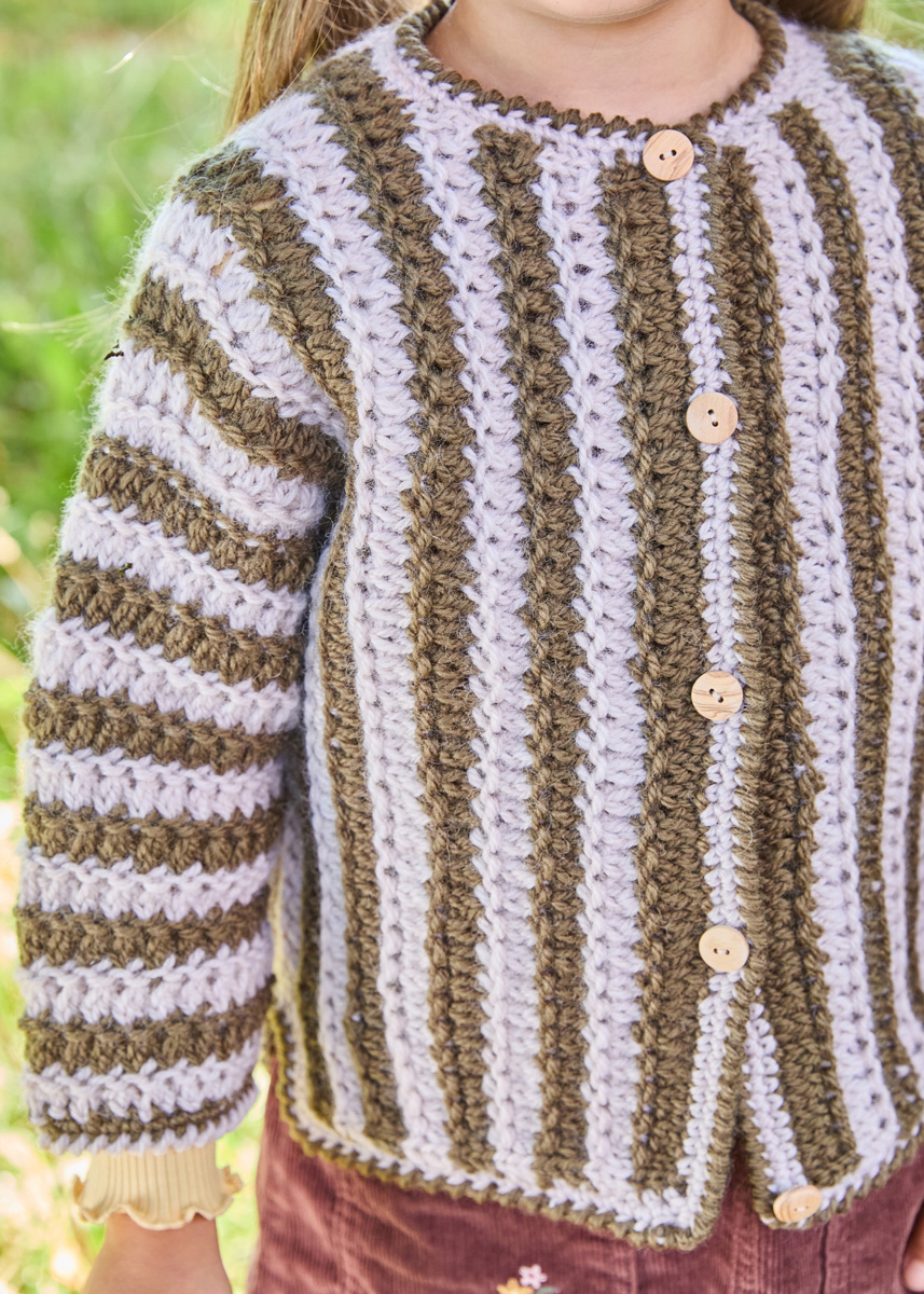 Lana Grossa-Qualität „Landlust- Naturwolle“ (100 % norwegische Schurwolle, LL ca. 85 m/50 g), je 150 g (200 g - 200 g) in Grège (Fb 18) und in Olivgrün (Fb 3); Stricknadeln Nr. 5, 1 Häkelnadel Nr. 4, 5 Holzknöpfe, ø 15 mm.