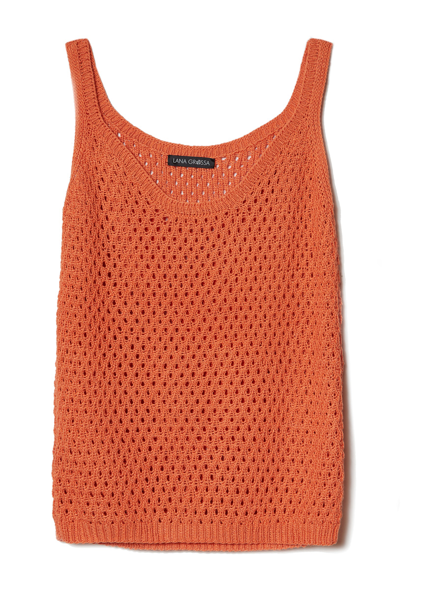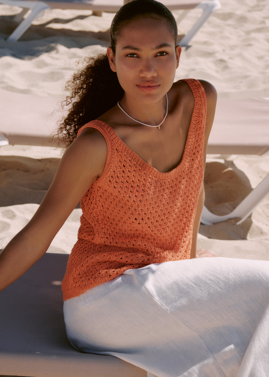 Leinengarn in Lachsorange, ein netzartiges Lochmuster und eine leicht verlängerte Silhouette: Die Deluxe-Version des klassischen Tanktops – hier cool inszeniert, mit einem schlichten Midi-Rock in Weiß.