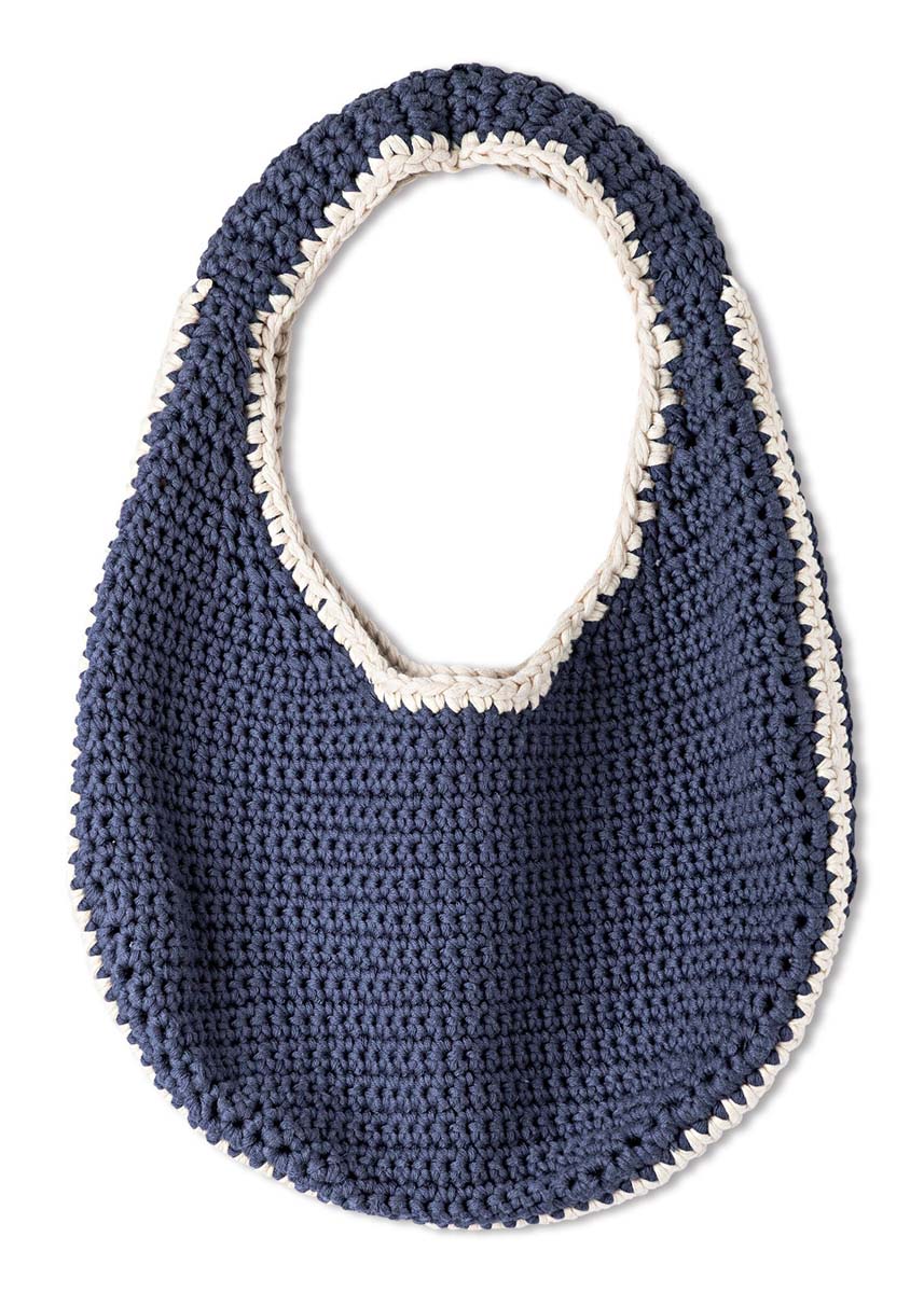 Lana Grossa-Qualität „Natural Cotton” (100 % (Bio) Baumwolle, LL = ca. 80 m/50 g): ca. 200 g Dunkelblau (Fb. 15) und ca. 100 g Eierschale (Fb. 8); je 1 Wollhäkelnadel Nr. 5,5 und 6.