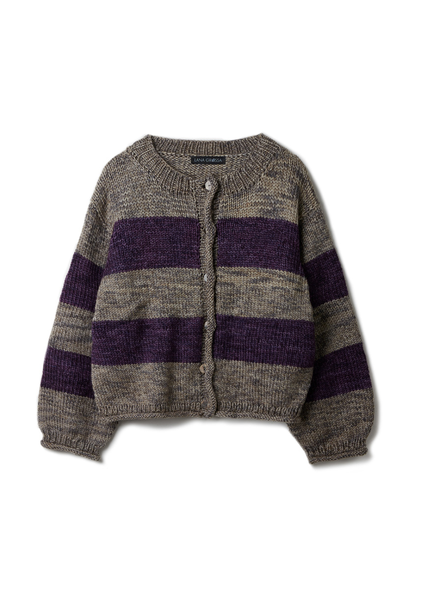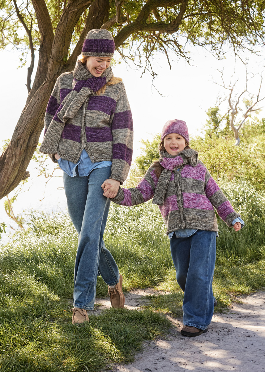 Lana Grossa Vintage Chunky (100% Schurwolle (Merino), LL = ca. 80 m/50 g), 400 (450 - 500) g in Beige/Khaki (Fb 1), 250 (250 - 300) g in Antikviolett/Aubergine (Fb 8). Je eine 40 cm lange, eine 80 cm lange und eine 120 cm lange Rundstrick-Nd, jeweils Nr 6; eine 40 cm lange, eine 80 cm lange und eine 120 cm lange Rundstrick Nd Nr 7. 2 Hilfs-Nd zum M stilllegen, 2 MM. 6 Knöpfe, ca. 20 mm Ø.