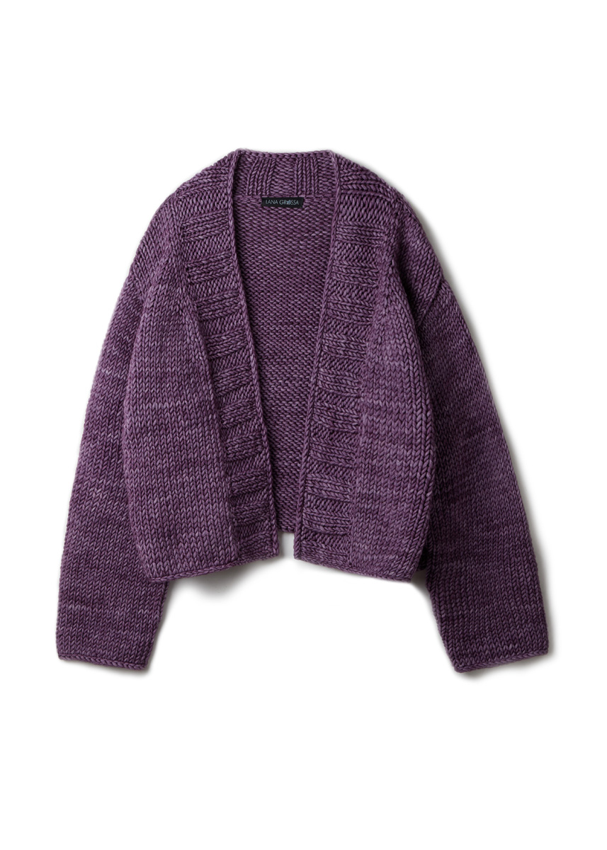 Lana Grossa Vintage Superchunky (100% Schurwolle (Merino), LL = ca. 80 m/100 g), 800 (900 - 1000) g in Antikviolett (Fb 515). Je eine 40 cm lange, eine 80 cm lange und eine 100 cm lange oder 120 cm lange Rundstrick-Nd Nr. 8; eine 120 cm lange Rundstrick-Nd Nr 6,5; eine Häkel-Nd Nr 5,5; 1 MM; 3 Hilfs-Nd zum M stilllegen.