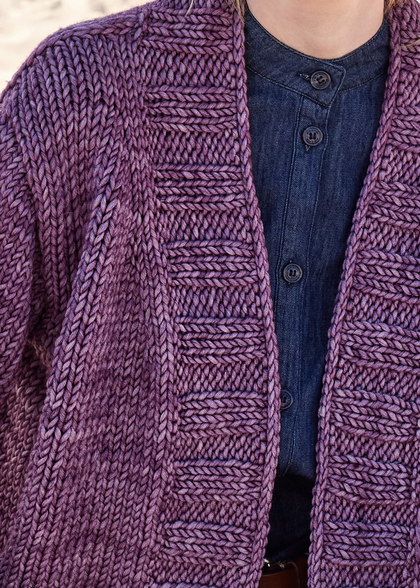 Die Jacke wird am Halsausschnittrand inklusive der Schulterpasse begonnen und von oben nach unten an einem Stück gestrickt.