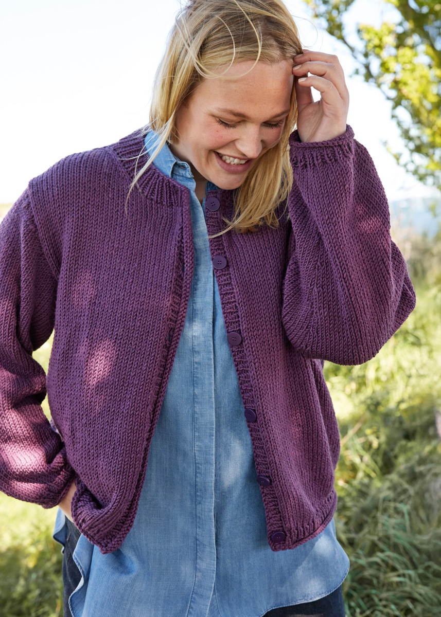 Die Jacke wird am Halsausschnittrand begonnen und von oben nach unten an einem Stück gestrickt.