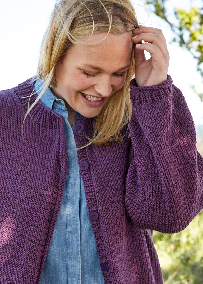 Lana Grossa Cool Wool Superbig (100% Schurwolle (Merino extrafine), LL = ca. 80 m/50 g), 600 (700 - 800) g in Aubergine (Fb 13). Je eine 40 cm lange, eine 80 cm lange und eine 120 cm lange Rundstrick-Nd, jeweils Nr 7; eine 50 cm lange, eine 80 cm lange und eine 120 cm lange Rundstrick Nd Nr 8. 2 Hilfs-Nd zum M stilllegen, 2 MM. 6 Knöpfe, ca. 20 mm Ø.