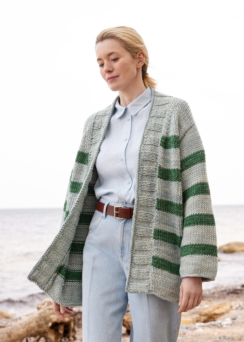 Die Jacke wird am Halsausschnittrand inklusive der Schulterpasse begonnen und von oben nach unten an einem Stück gestrickt.