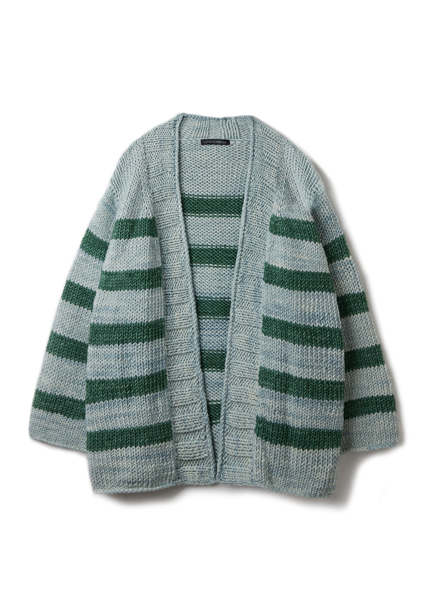 Lana Grossa Vintage Superchunky (100% Schurwolle (Merino), LL = ca. 80 m/100 g), 800 (800 - 900) g in Weißgrün (Fb 517) und 300 g in Opalgrün (Fb 518). Je eine 40 cm lange, eine 80 cm lange und eine 100 cm lange oder 120 cm lange Rundstrick-Nd Nr. 8; eine 120 cm lange Rundstrick-Nd Nr 6,5; eine Häkel-Nd Nr 5,5; 1 MM; 3 Hilfs-Nd zum M stilllegen.