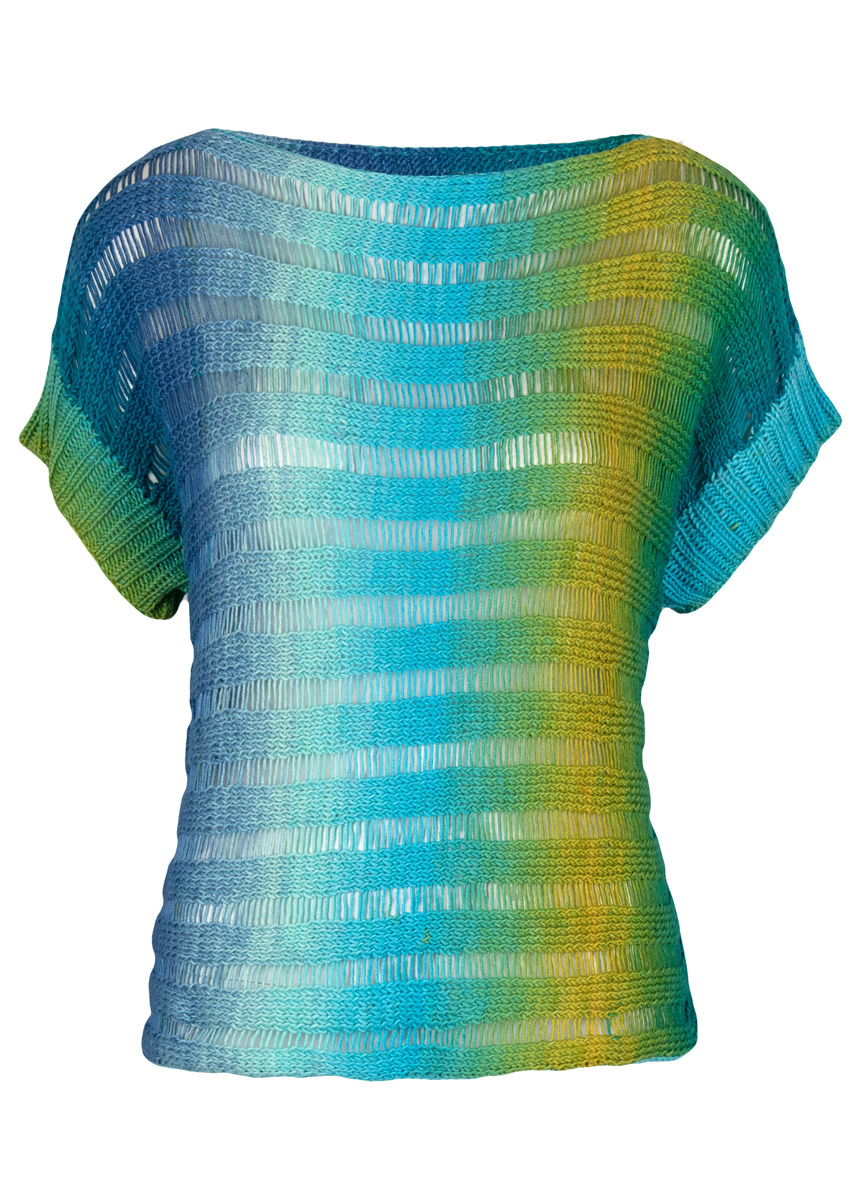 Lana Grossa Gomitolo Aloha (50 % Baumwolle, 50 % Viskose, Lauflänge 250 m/100 g), 300 (300 – 400) g Türkis/Blau/Smaragd/Apfelgrün/ Gelboliv/Himmelblau (Fb 304); Stricknadeln Nr. 4,5, 1 Rundstricknadel Nr. 4,5, 40 cm lang, 1 Spiel Stricknadeln Nr. 4,5.