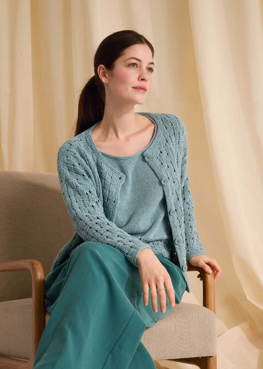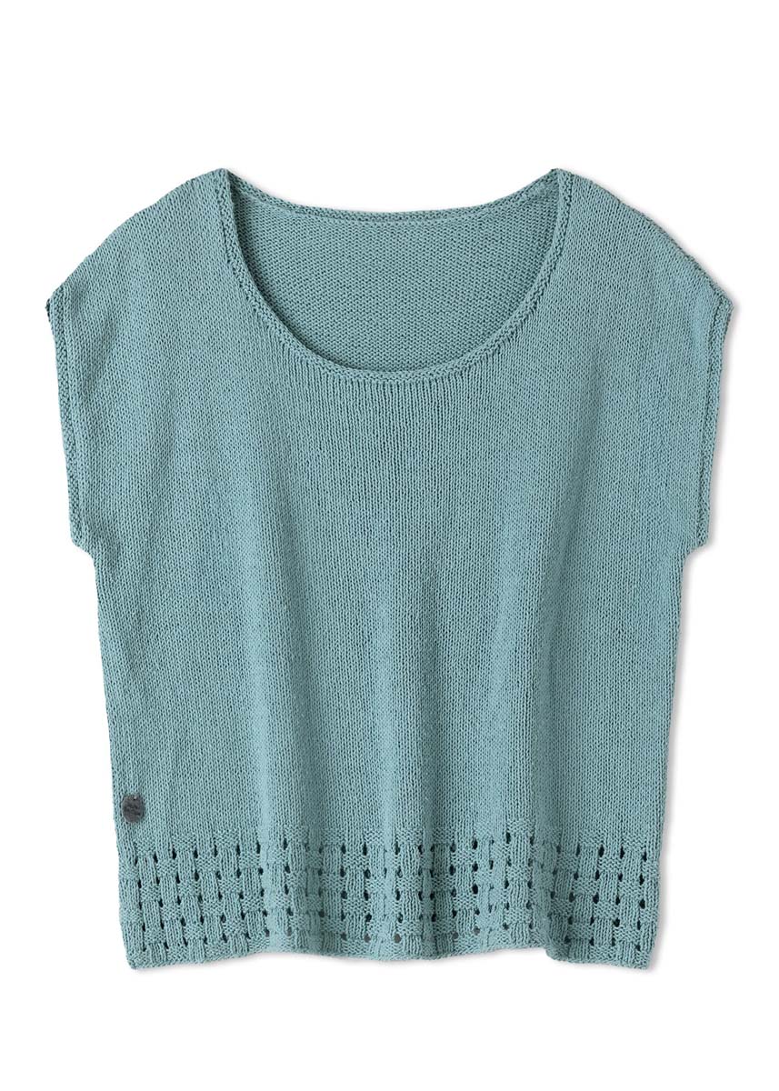 Lana Grossa Setapura (100% Seide, Lauflänge 200 m/50 g), 200 (250 – 300 – 350) g Minttürkis (Fb. 13); Stricknadeln Nr. 2,5, 3 und 3,5, 1 Rundstricknadel Nr. 3, 40 cm lang.