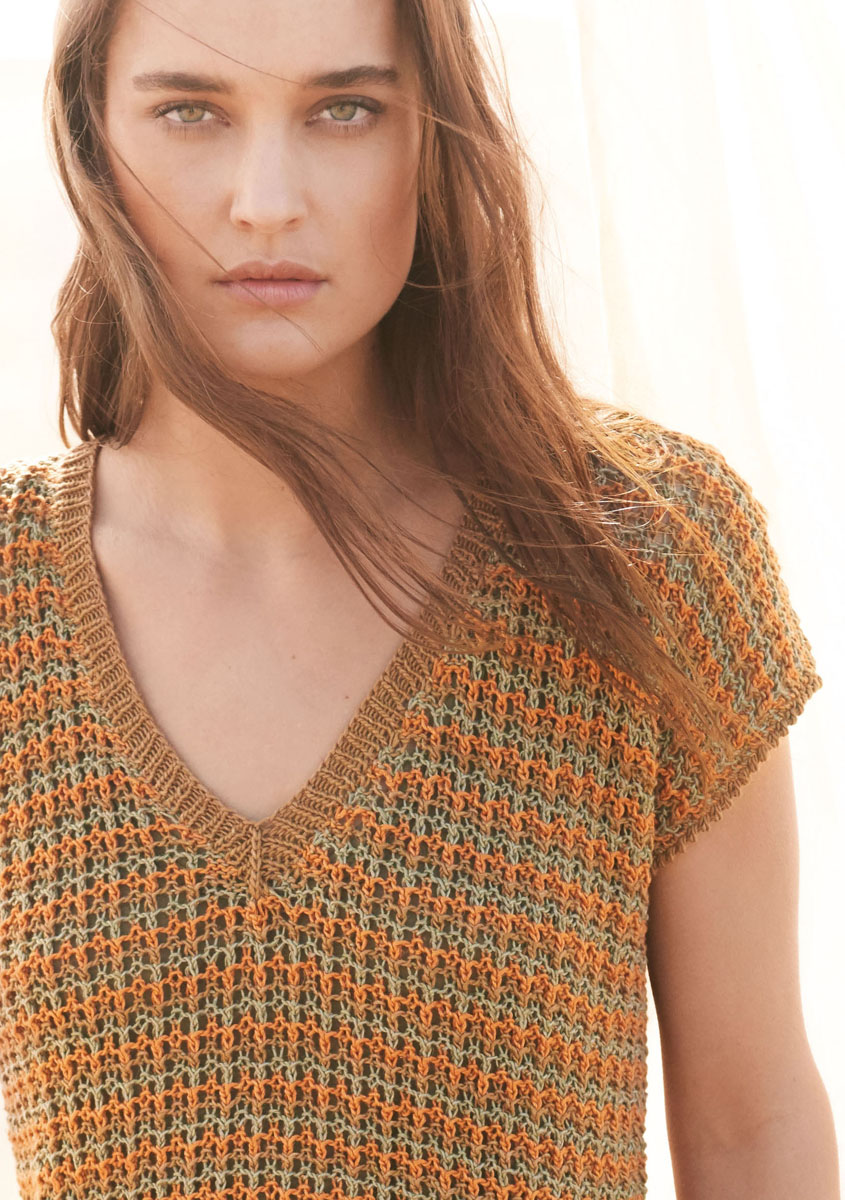 Lana Grossa Solo Lino (80 % recyceltes Leinen (Viskose), 20 % Leinen, Lauflänge 120 m/50 g) 150 (150 - 200) g Nugat (Fb 9), 100 (100 - 150) g Schilf (Fb 8) und 100 (100 - 150) g Cognac (Fb 10); Stricknadeln Nr. 3,5, eine 40 cm lange Rundstricknadel Nr. 3, Häkelnadel Nr. 3.