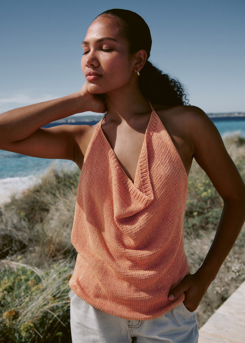 Basis für das elegante Neckholder-Top ist ein glatt rechts gestricktes Viereck mit abgerundeten Seiten, die im Rücken zusammengenäht werden. Der Wasserfallausschnitt wird von feinen Bändern gehalten.