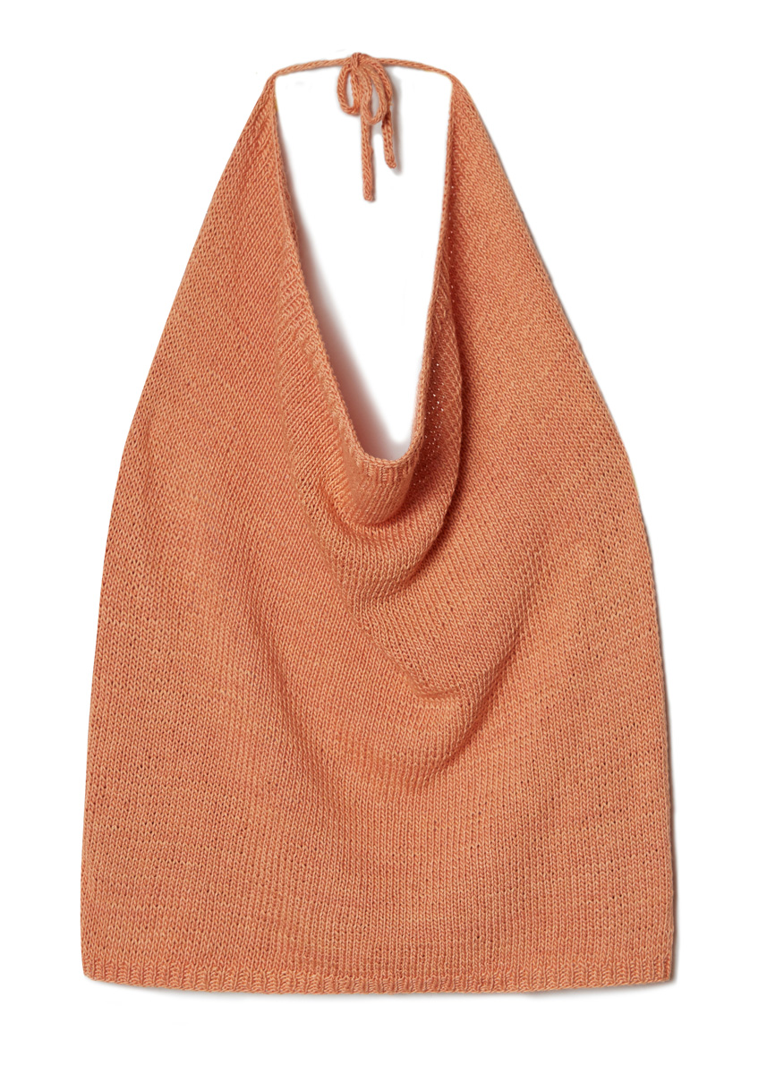 Lana Grossa-Qualität „Solo Lino” (80 % rec. Leinen (Viskose), 20 % Leinen, LL = ca. 120 m/50 g): ca. 200 (250) g Lachs (Fb. 63); 1 Rundstricknadel Nr. 3,5, 80 cm lang, für die Kordeln 2 Spielstricknadeln Nr. 3,5.