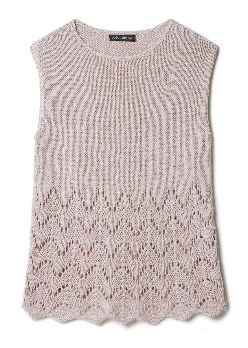 Das pudrige Ajour-Zackenmuster- Top besteht aus doppelt verstricktem Leinengarn. Praktisch: Durch den blickdichten Brustbereich lässt es sich unkompliziert stylen. Anleitung bis Größe 48/50
