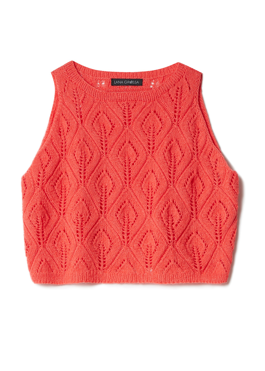 Beim korallenroten Ajourmuster-Top sorgen amerikanische Schultern für Eleganz. Sein Schlauchgarn ist mit wärmenden Merinofasern gefüllt – perfekt für lange Sommernächte.
