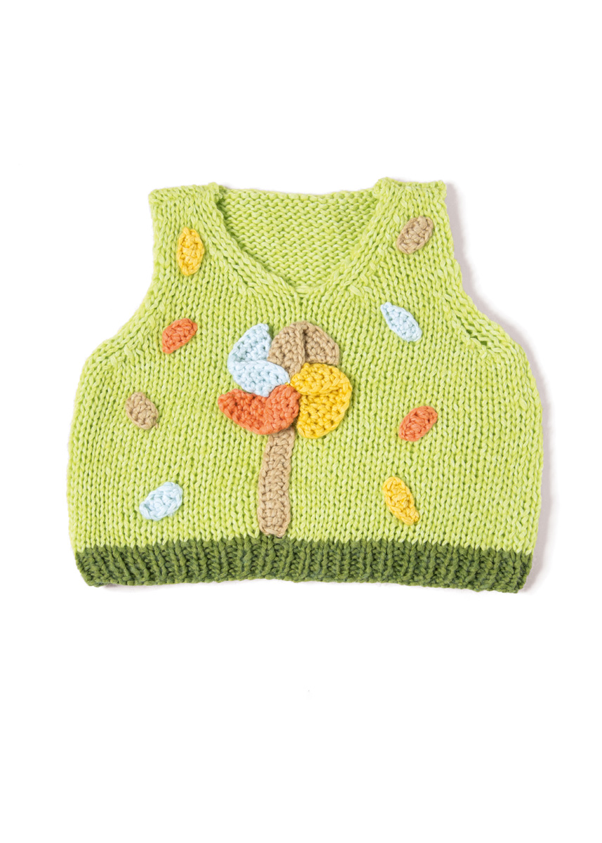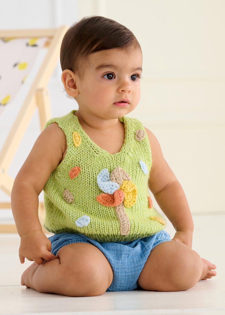 Lana Grossa Summer Softness (80% (Bio) Baumwolle, 20% Schurwolle (Merino superfein); LL = 130 m/50 g): 50 (50/50/100) g Frühlingsgrün (Fb. 13) und je 50 g Blattgrün (Fb. 14), Beige (Fb. 3), Braunorange (Fb. 22), Gelb (Fb. 11) und Pastellblau (Fb. 17) je eine Rundstricknadel 5 mm und 5,5 mm; eine Häkelnadel 5 mm; Maschenmarkierer.