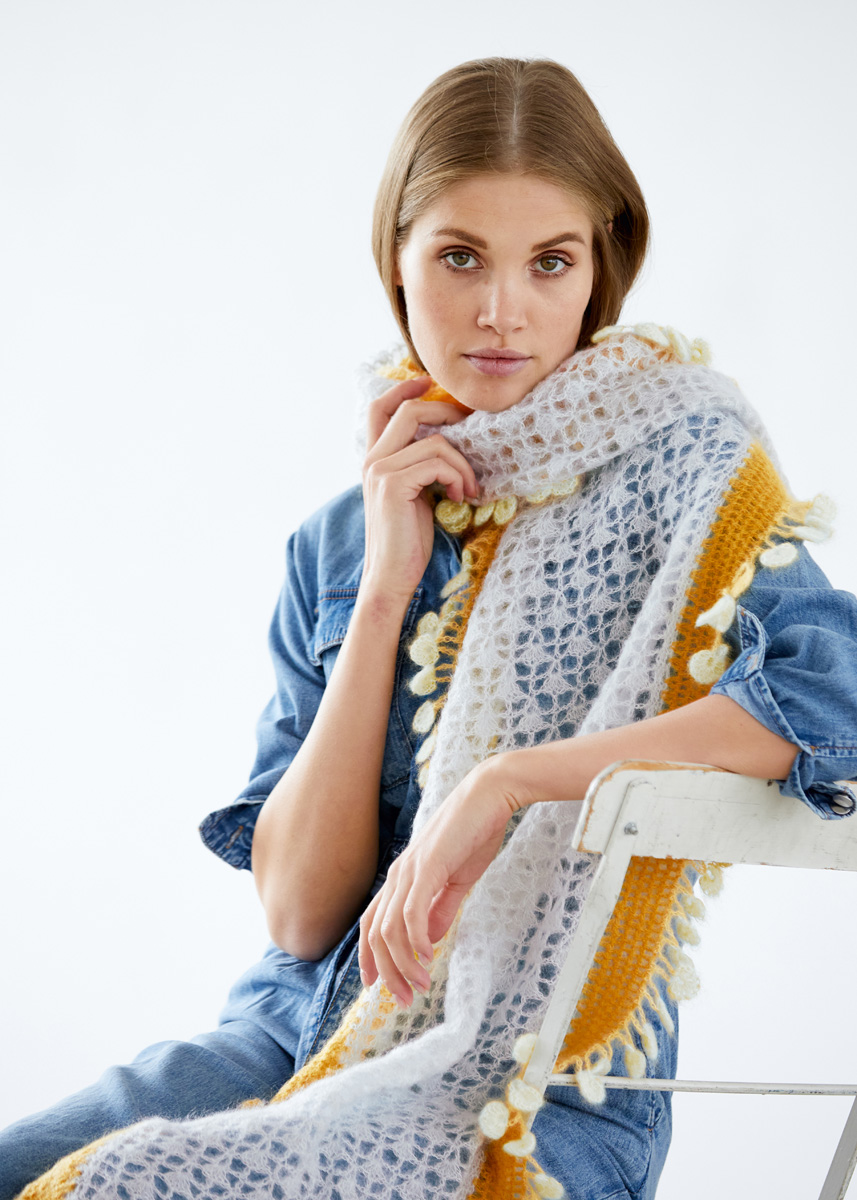 Lana Grossa Silkhair (70% Mohair, 30% Seide, Lauflänge 210 m/25 g), 75 g Silbergrau (Fb 41), 50 g Bernstein (Fb 146) und 50 g Rohweiß (Fb 52); 1 Häkelnadel Nr. 4.