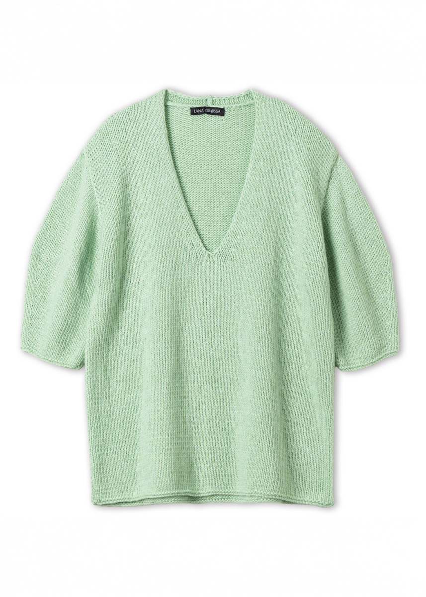 Lana Grossa-Qualität „Summer Softness“ (80 % Baumwolle (Bio), 20 % Schurwolle (Merino superfine), LL = ca 130 m/50 g): ca 400 (450 - 500 - 550) g Weißgrün (Fb 23); Stricknadeln Nr 6.
