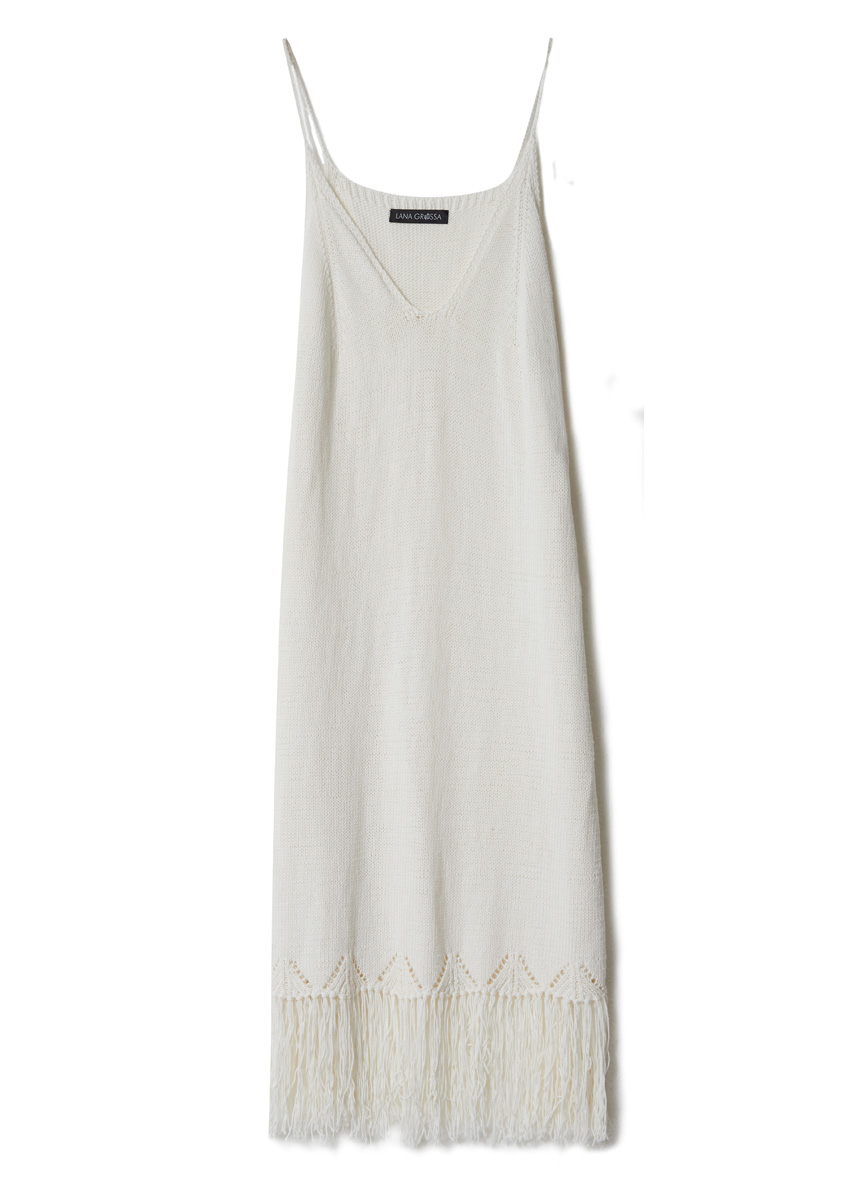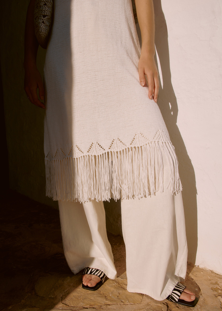 Macht jeden Schritt zu einem kleinen Ereignis: Die Tunika mit Ajour-Mustersaum und langen, angeknüpften Fransen. Ihr Bustier wurde in Form gestrickt und mündet in zarten Spaghetti- Trägern.
