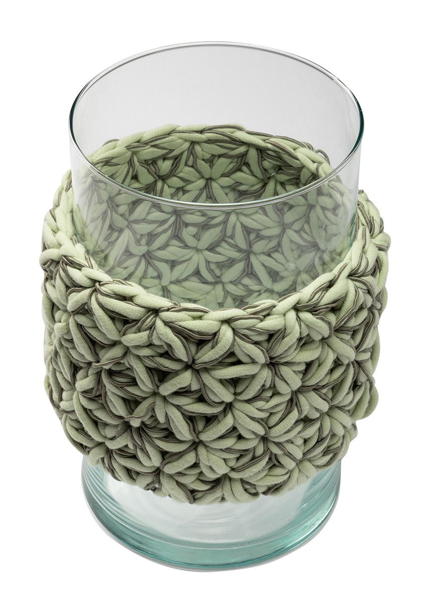 Lana Grossa-Qualität „The Tube” (60 % Baumwolle, 40 % Nylon, LL = ca. 114 m/200 g): ca. 200 g Weißgrün (Fb. 31) und Lana Grossa-Qualität „The Core” (50 % Baumwolle, 50 % Polyester, LL = ca. 85 m/100 g): ca. 200 g Graugrün (Fb. 6); 1 Wollhäkelnadel Nr. 9; einen Glaszylinder, ø 15 cm, 25 cm hoch.