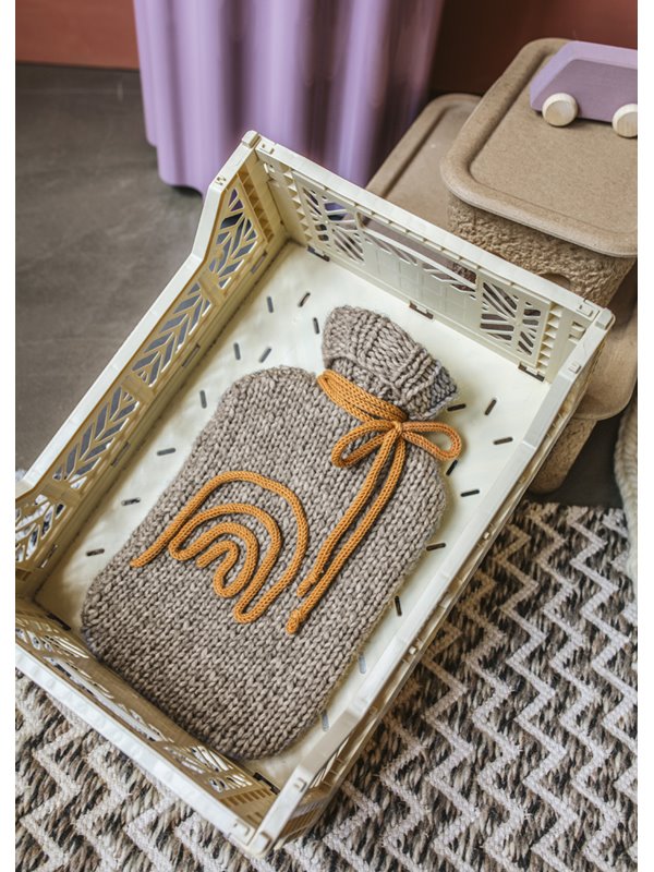 Hier versüßen applizierte Kordel-Motive einen selbstgestrickten Wärmflaschenbezug. Das kann, wie links, ein Regenbogen sein. Funktioniert aber auch mit Herz, Stern und Co.