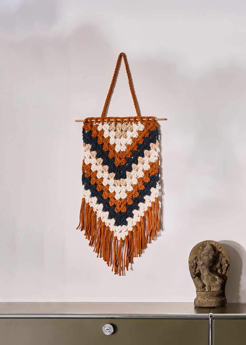Lana Grossa-Qualität „The Tube” (60 % Baumwolle, 40 % Nylon, LL = ca. 114 m/200 g): je ca. 200 g Creme (Fb. 2), Beige (Fb. 17), Rost (Fb. 6) und Nachtblau (Fb. 21); 1 Wollhäkelnadel Nr. 9, 1 Rundstab aus Holz, ø 1 cm, ca. 40 cm lang.