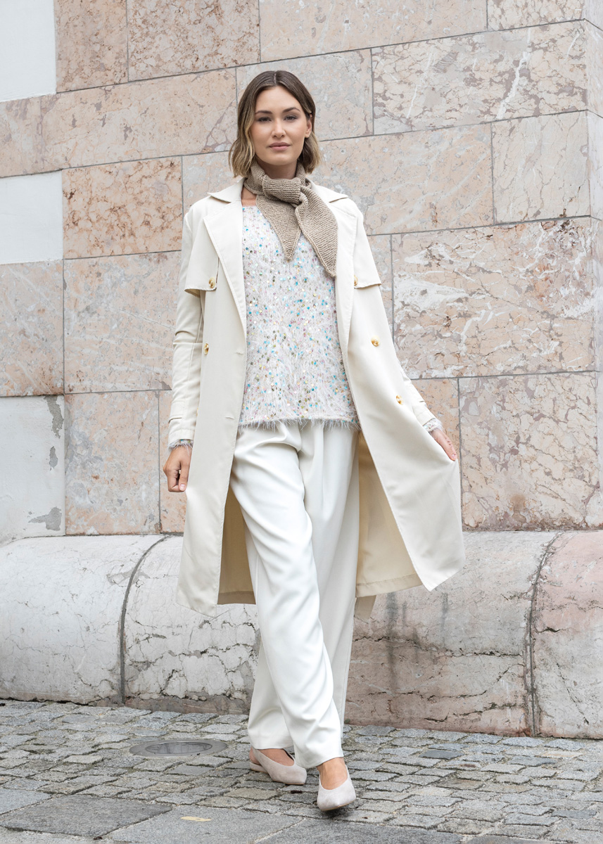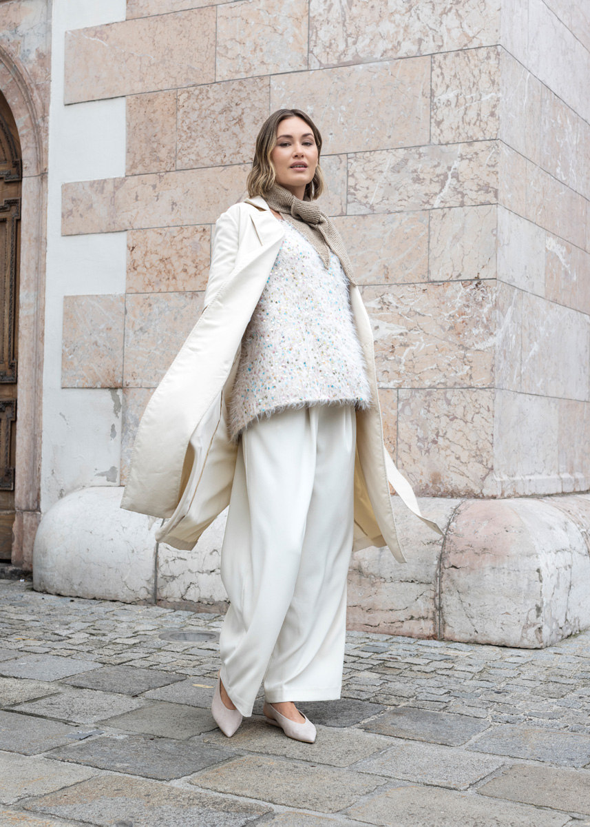 Das Modell hat eine Gesamtlänge von 60 (62 - 64 - 66 - 68 - 70) cm und eine Brustmehrweite von 40 cm bei 80 cm Brustumfang (40 cm bei 88 cm Brustumfang - 36 cm bei 96 cm Brustumfang - 36 cm bei 104 cm Brustumfang - 32 cm bei 116 cm Brustumfang - 32 cm bei 128 cm Brustumfang).