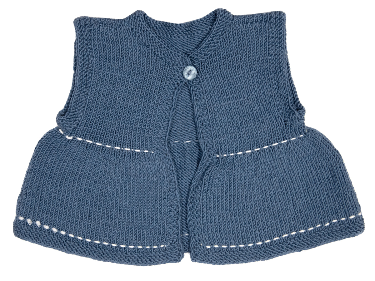 Lana Grossa Cool Wool (100 % Schurwolle, Lauflänge 160 m/50 g) 100 (100/150) g Graublau (Fb 2037) und 50 g Weiß (Fb 431); Stricknadeln Nr. 3,5, eine 40 cm lange Rundstricknadel Nr. 3,5, Nadelspiel Nr. 3,5, Häkelnadel Nr. 3; ein Knopf mit 15 mm Ø.