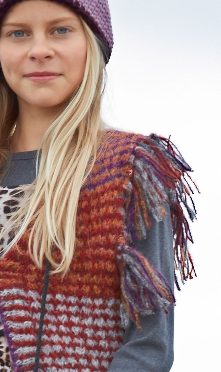 Lana Grossa Qualität „Garzato Fleece“, (70% (Baby) Alpaka, 30% Polyamid, LL = 225 m/50 g), je ca. 50 g Grau/Schwarz (Fb 10), Rohweiß/Schwarz (Fb 11), Rot/Schwarz (Fb 1), Orange/Gelb/Schwarz (Fb 16) und Lila/Schwarz (7), Stricknadeln Nr. 6 und 1 Häkelnadel Nr. 5, 1 Knopf von UNION KNOPF, Art. 451456, Fb Grau, Gr. 20 mm.