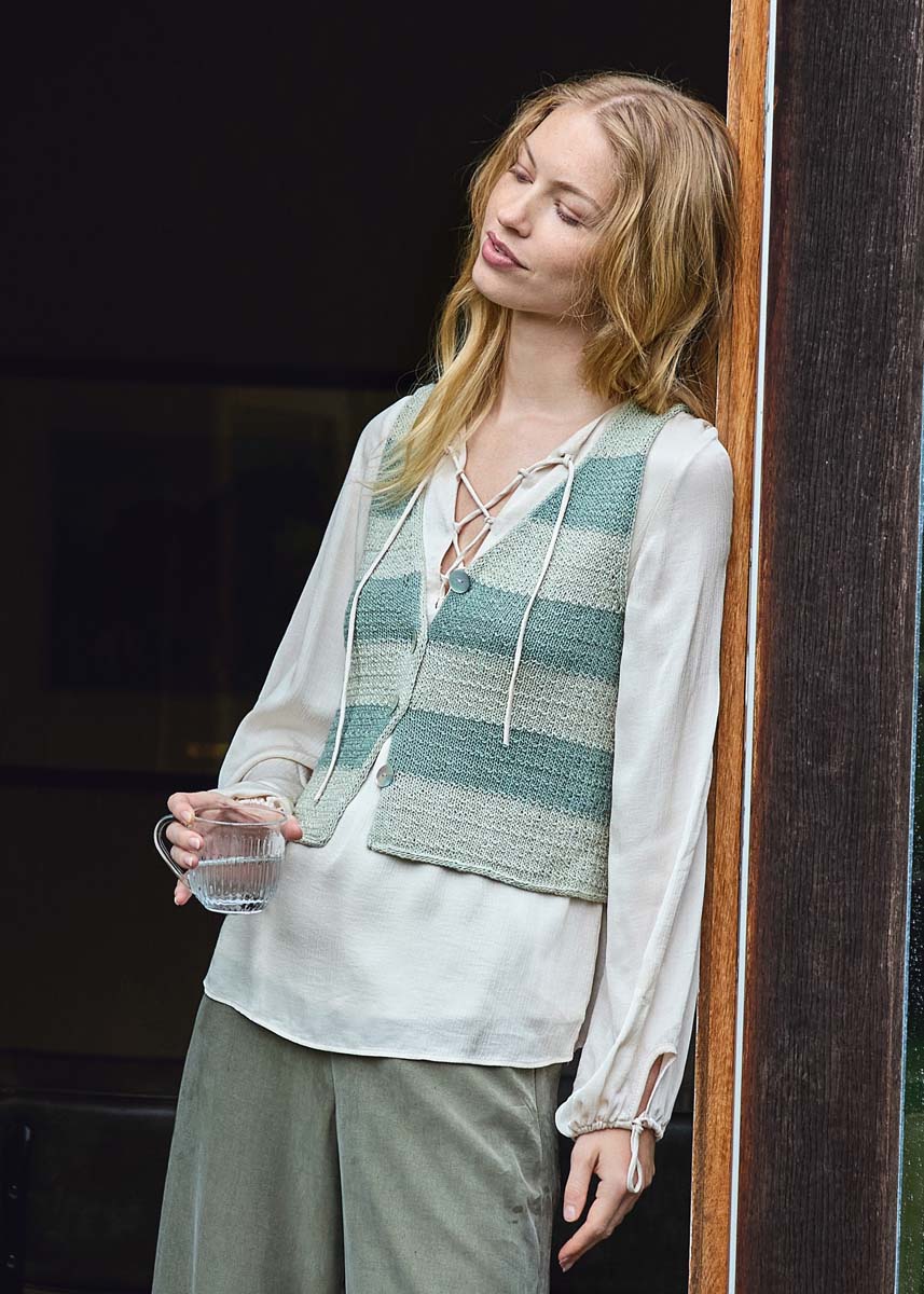 Lana Grossa-Qualität „Solo Lino” (80 % rec. Leinen (Viskose), 20 % Leinen, LL = ca. 120 m/50 g): ca. 150 (200 – 250) g Pastellgrün (Fb. 60) und ca. 100 (150 – 150) g Resedagrün (Fb. 20); je 1 Rundstricknadel Nr. 3, 60 und 100 cm lang; 4 Perlmuttknöpfe, ø 20 mm, blassgrün.
