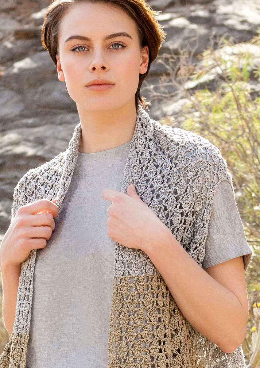 Lana Grossa Solo Lino (80 % recyceltes Leinen (Viskose), 20 % Leinen, Lauflänge 120 m/50 g) 250 (300 – 350) g Grüngrau (Fb 5) und 200 (250 – 300) g Schilf (Fb 8); Häkelnadel Nr. 4.