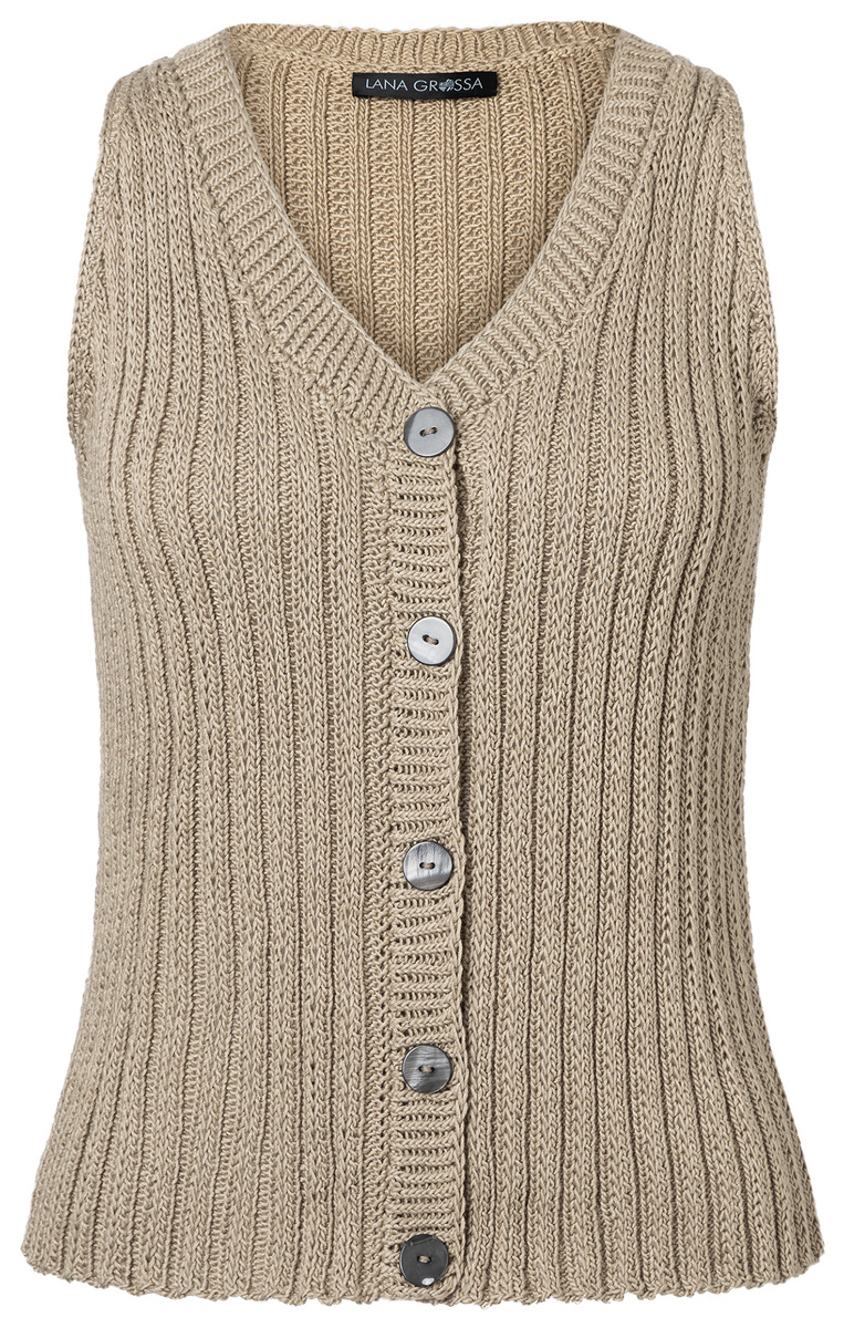 Luftige Westen feiern gerade ihr Comeback. Unser Modell hat sportliche Rippen und schmale, feminine Schultern. Das funktioniert nicht nur mit Hosen, sondern auch mit flatternden Maxikleidern und -röcken.