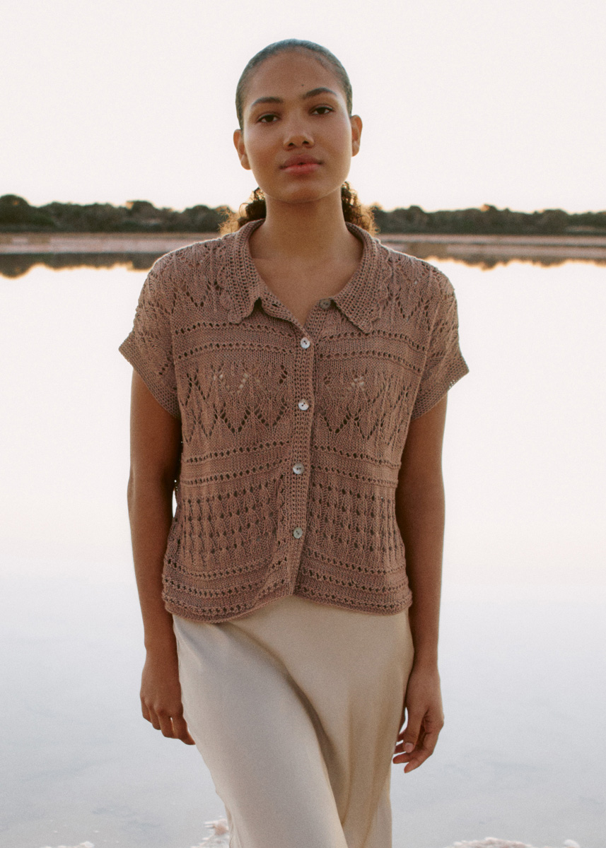 Lana Grossa-Qualität „Solo Lino” (80 % rec. Leinen (Viskose), 20 % Leinen, LL = ca. 120 m/50 g): ca. 350 g Nougat (Fb. 54); Stricknadeln Nr. 3,5, 1 Wolhäkelnadel Nr. 4; 6 Perlmuttknöpfe in Natur, ø 15 mm.