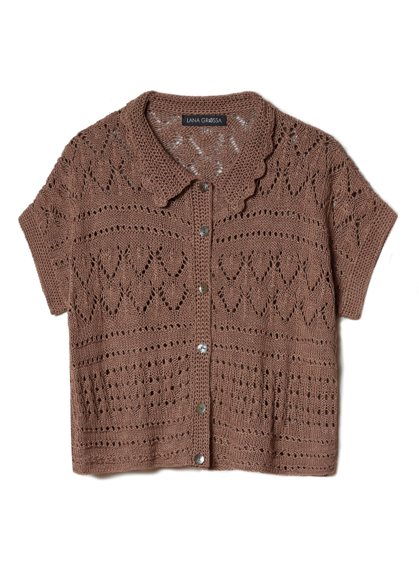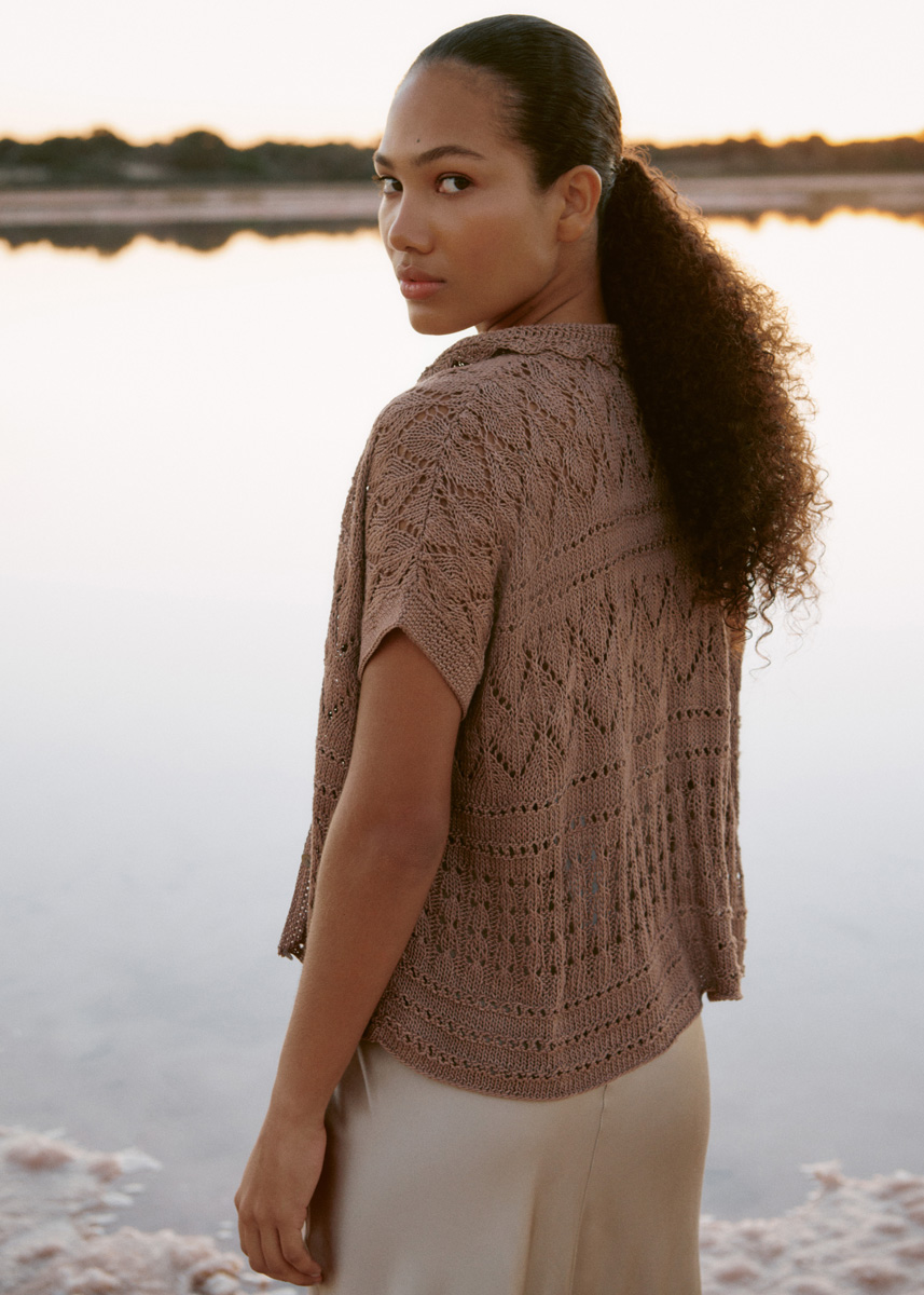 Die Strick-Weste im Lochmustermix hat eine gerade Silhouette und einen gehäkelten Kragen mit verspieltem Muschelrand. Abgeschrägte Schultern optimieren seine Passform. Der sanfte Nougatton bringt Ruhe ins Modell.