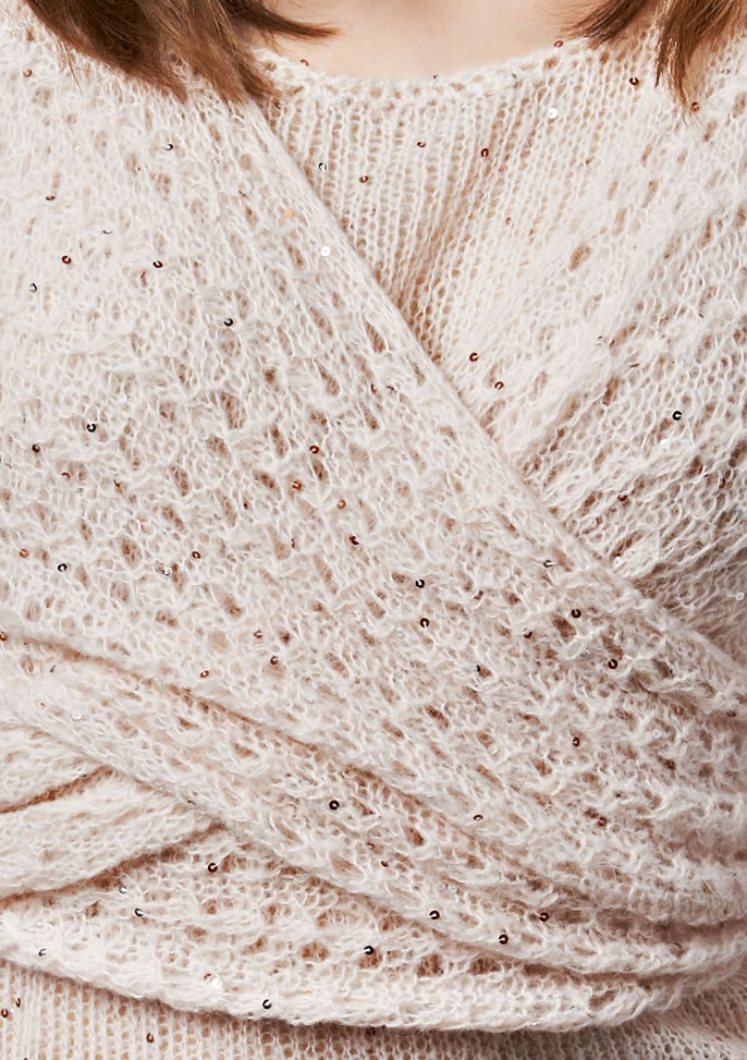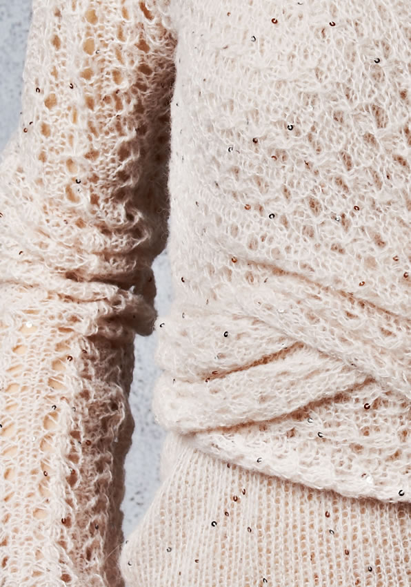 Lana Grossa-Qualität „Lace Paillettes“ (45 % (Baby) Alpaka, 20 % Schurwolle (Merino), 15 % Polyamid, 15 % Baumwolle, 5 % Polyester, Lauflänge ca. 150 m/25 g): ca. 125 (150) g Puderrosa (Fb. 27); Stricknadeln Nr. 4,5, 1 Rundstricknadel Nr. 4, 60 cm lang
