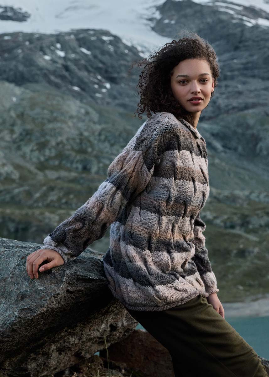 Lana Grossa-Qualität „Gomitolo Fumo“ (50 % Schurwolle, 50 % Polyacryl, LL = ca 700 m/200 g): 2 (3) Knäuel = ca 400 (600) g Zart-/Hell-/Mittel-/Dunkelgrau/ Grège/Anthrazit (Fb 518); Stricknadeln Nr 4,5 und 5; 1 kurze Rundstricknadel Nr 4,5; 1 Zopfnadel.