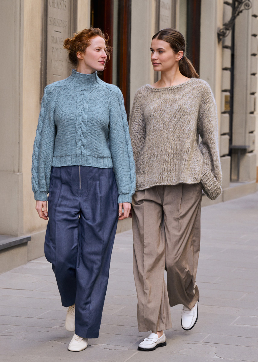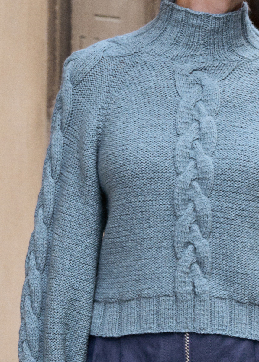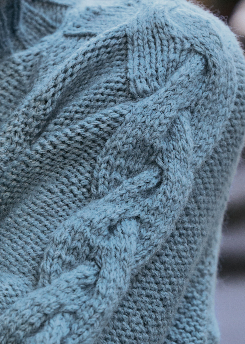 Kontrastprogramm: Krause Maschen zu voluminösen Zöpfen und weite Raglanärmel zum schmalen Rumpf. Das Rückteil des Pullis ist etwas länger – ein Effekt, der durch verkürzte Reihen entsteht.