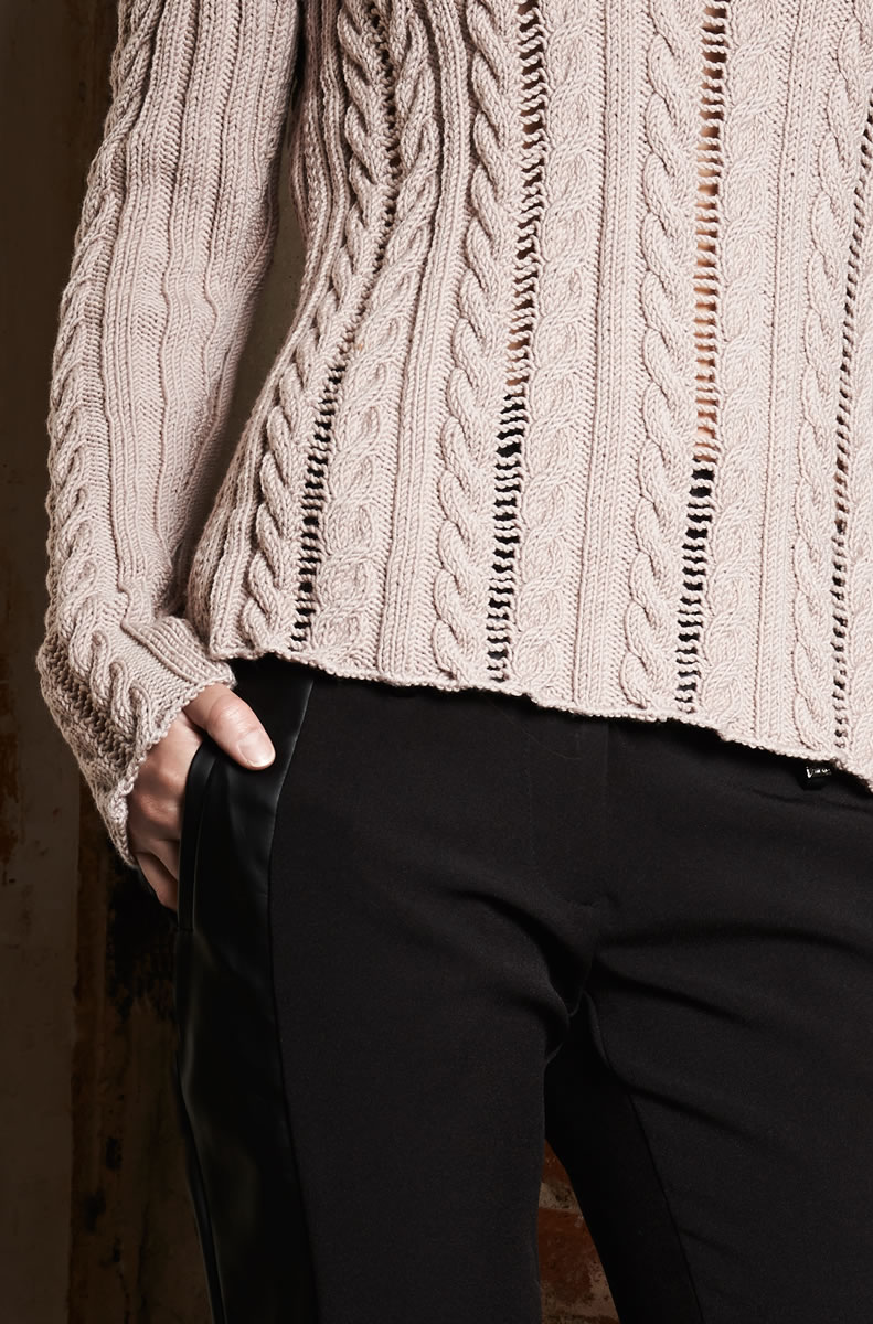 Unkomplizierte Klassiker bilden den perfekten Rahmen für die eigentlichen Stars bei Maschenlooks: den Mustern. Der Mix aus Zopf- und Lochstrukturen, langen Ärmeln und einem sexy V-Ausschnitt geben diesem Pulli den stylischen Kick.