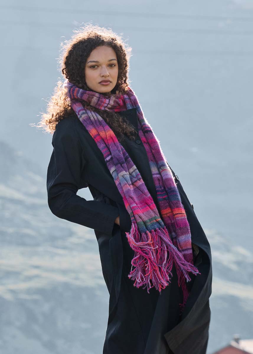 Lana Grossa-Qualität „Gomitolo Intenso“ (50 % Schurwolle, 50 % Polyacryl, LL = ca 700 m/200 g): 2 Knäuel = ca 400 g Pink/Fuchsia/Rosa/Erika/Graulila/Orchidee/Kobaltblau (Fb 233); Stricknadeln Nr 5; 1 Zopfnadel; 1 Häkelnadel Nr 5.